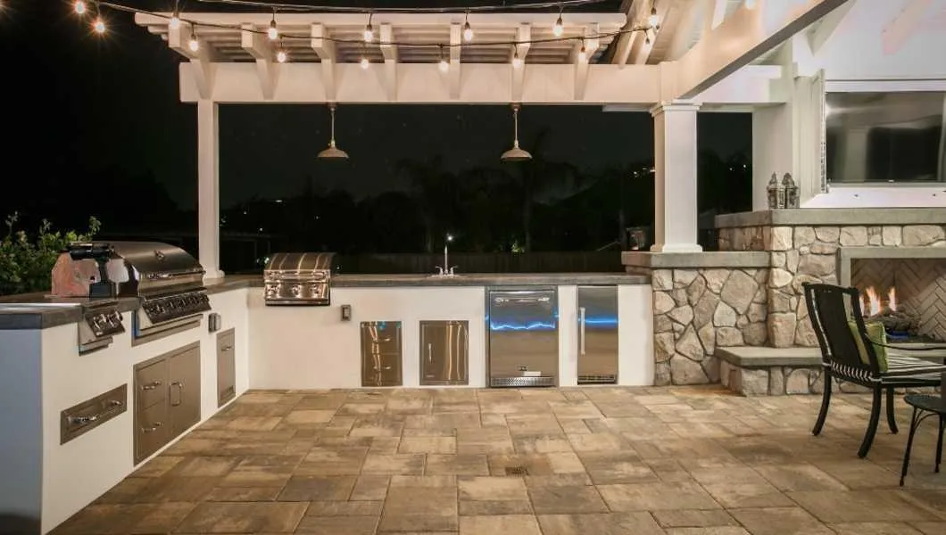 Yes. We can integrate plumbing, gas lines, and electrical systems into your outdoor kitchen for full functionality, including sinks, refrigerators, and lighting.